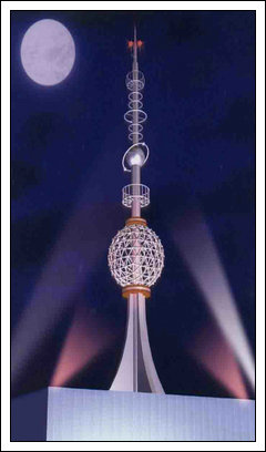 塔體的造型新穎別致,塔體外部包有不銹鋼板(或鈦金板),塔體上部安裝有各種不銹鋼環(huán),白天在陽光的照射下,閃閃發(fā)光,高貴無比,夜色降臨塔與LED燈光相映,更加使建筑物美倫美幻。